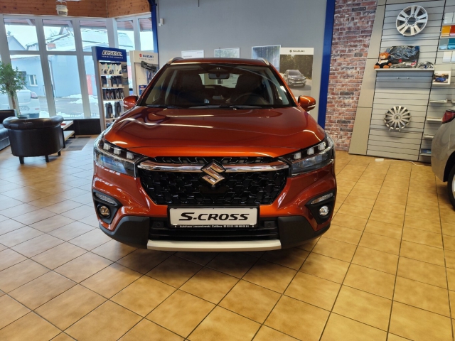 • Orangefarbener Suzuki S-Cross Hybrid in Front-Seitenansicht